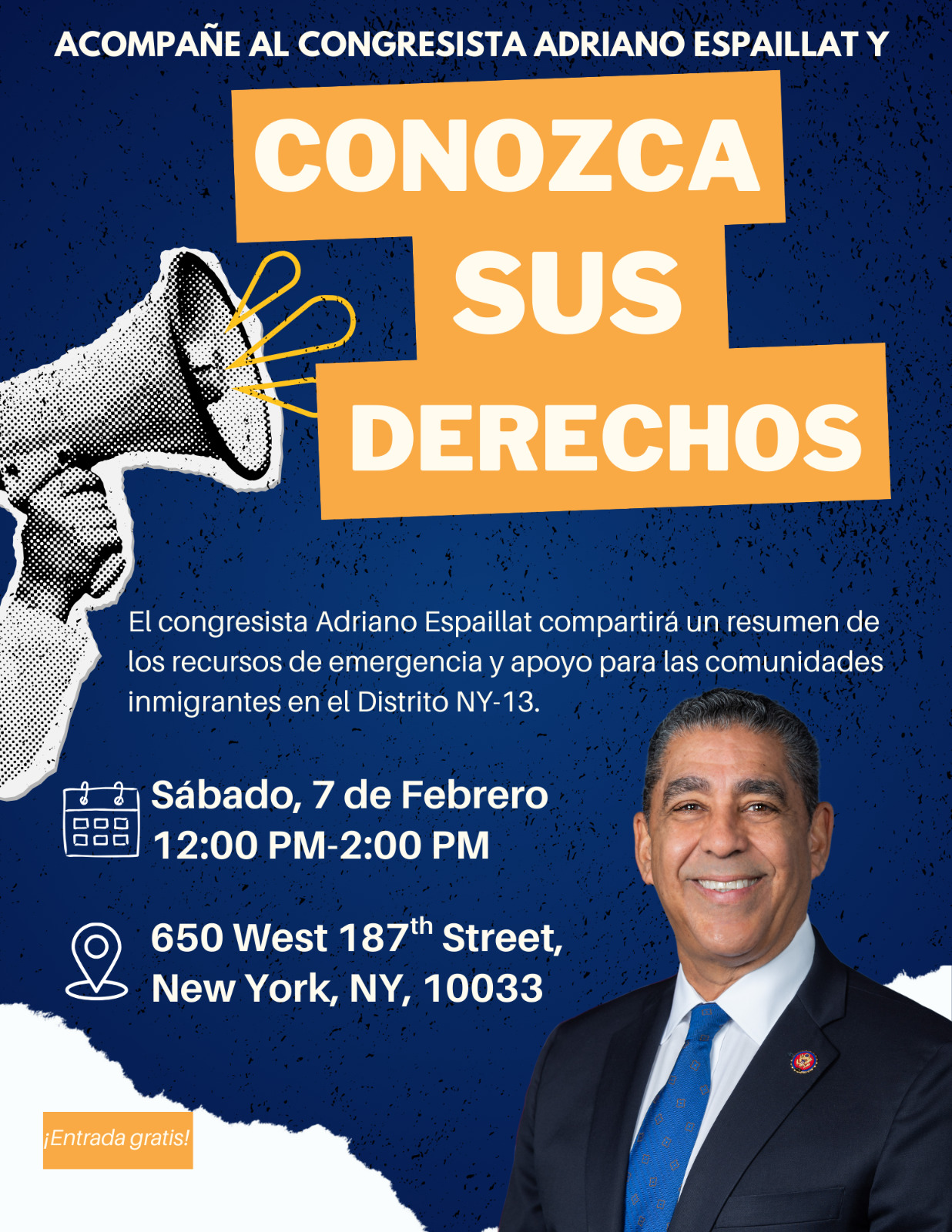 Confirmar su asistencia: https://www.eventbrite.com/e/know-your-rights-hosted-by-congressman-adriano-espaillat-tickets-1982464811618?aff=oddtdtcreator